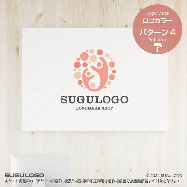 大小さまざまな円(ドット)が集まり、その中心に「親と子」が手を取り合う姿を表現したロゴデザインです。大きな人が小さな人を包み込む形は「家族」・「見守り」・「支え合い」を象徴し、見る人に安心感と優しさを伝えます。周囲のドットは溢れ出す「アイデア」・「希望」・「可能性」、それらを支える「地域や社会のコミュニティ」を象徴しています。全体を円形(サークル)にまとめることで、組織の和や団結力、包括的なサポートを視覚的に伝えることのできる温かみと躍動感のあるロゴデザインです。