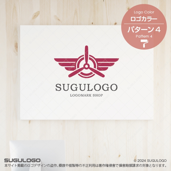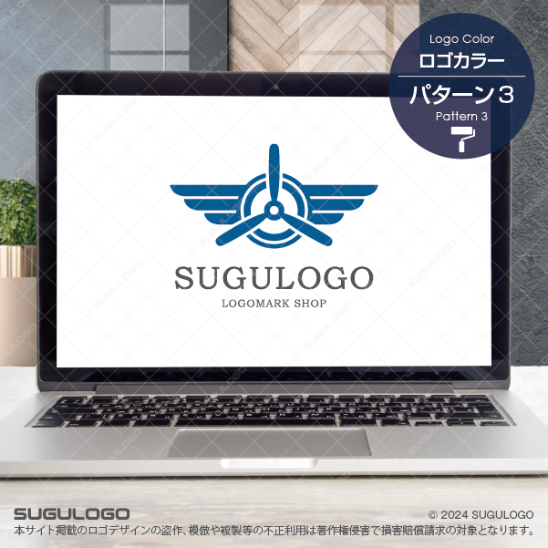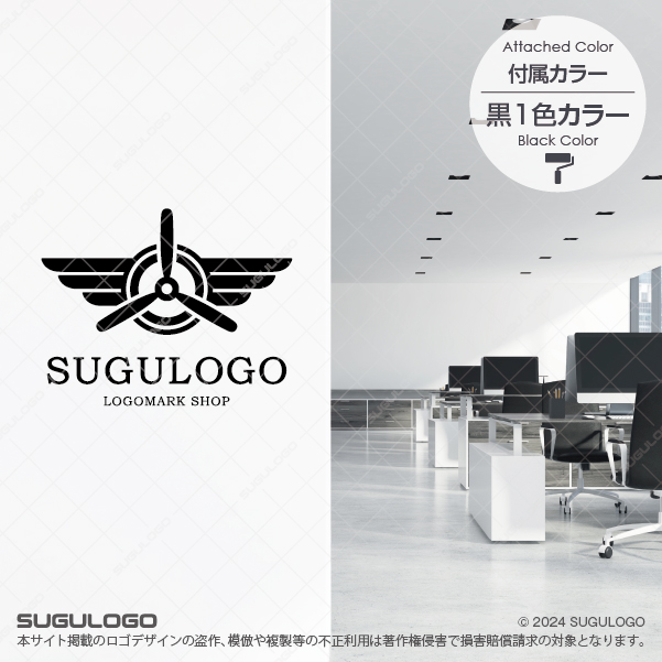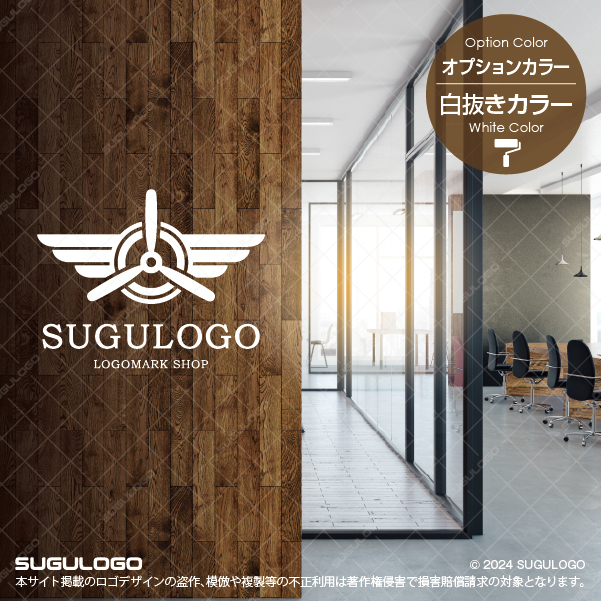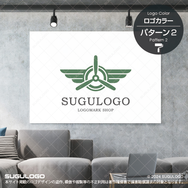 航空機のプロペラと翼をモチーフにしたクラシックで格調高いエンブレムロゴです。飛躍・成長・挑戦といった前向きイメージを象徴し、ブランドの方向性を力強く表現します。航空関連ビジネスや航空機サービスに最適な威厳と伝統を感じさせるデザインです。左右対称の翼とプロペラが生み出す安定感あるデザインが、航空業界の信頼性と専門性を力強く表現しています。ヴィンテージ感と重厚感を併せ持つデザインは、航空業界の歴史と伝統を感じさせます。航空機整備・メンテナンス事業、パイロット養成スクール 、航空イベント企画・運営、・ドローン事業・空撮サービス、物流など、「速さ」「機動力」「革新性」を重視するビジネスに適しています。
