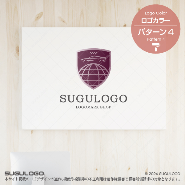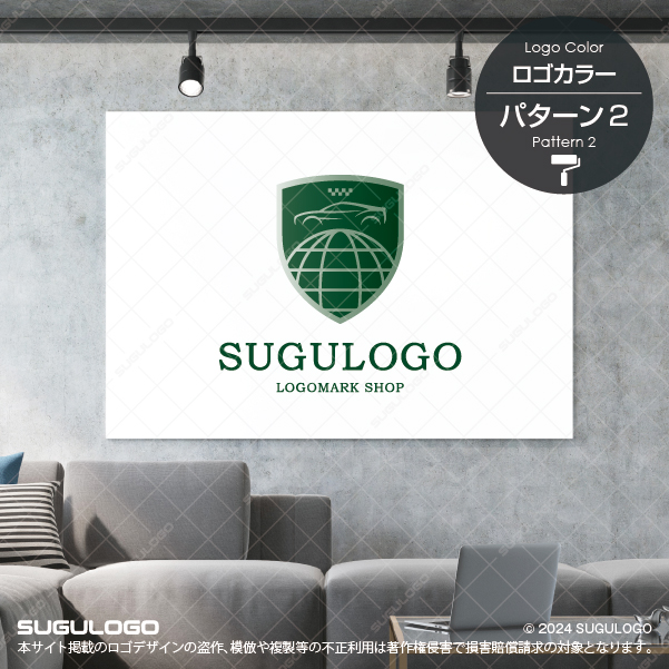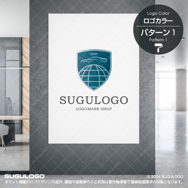 シールド型エンブレムに先進性を感じさせるモチーフを組み合わせたロゴマークです。グローバル性・テクノロジー・スピード感の要素を表現しており、力強く洗練された印象を与えます。盾(シールド)をベースにした信頼感のある堅牢なフォルムと、流麗な車のラインとチェッカーフラッグでスピードと達成を表現しています。チェッカーフラッグは目標達成を意味し、世界規模で展開する輸送サービスや、次世代のモビリティシステムを構築する企業のアイデンティティとして信頼感を与えます。地球のグリッドで国際性とグローバルなサービス展開を象徴しているため、自動車関連、IT・テクノロジー、セキュリティ、国際的なサービスや企業ブランディングに適しています。