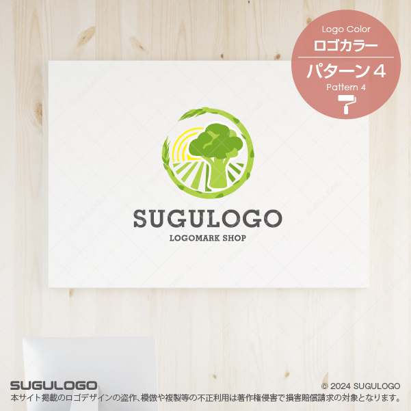 ロゴデザインです。円形のフレームの中に、瑞々しく実ったブロッコリーを中心に配し、その周囲をしなやかなアスパラガスの意匠で包み込むことで、豊かな大地の恵みと素材への誠実な情熱を表現しています。背景に描かれた放射状のラインは、降り注ぐ太陽の光と畑の畝を象徴しており、自然のエネルギーを一身に浴びて育つ作物の生命力と、揺るぎない品質への誇りを視覚的に伝えます。シンボルマークとして描かれた具体的な野菜のモチーフと、調和のとれた円のディテールは、見る者に素材の鮮度と生産者の確かな技術を感じさせる一塊のデザインです。この造形は、大地への感謝と、食を通じて健やかな暮らしを創造する喜びを形にしたものであり、信頼を礎に豊かな食の価値を届ける姿勢を示しています。普遍的な価値を保ち続け、組織の結束を深めながら、発展的なビジョンを力強く後押しします。【おすすめの業種】飲食店、食品加工、流通、健康食品、観光業、農業