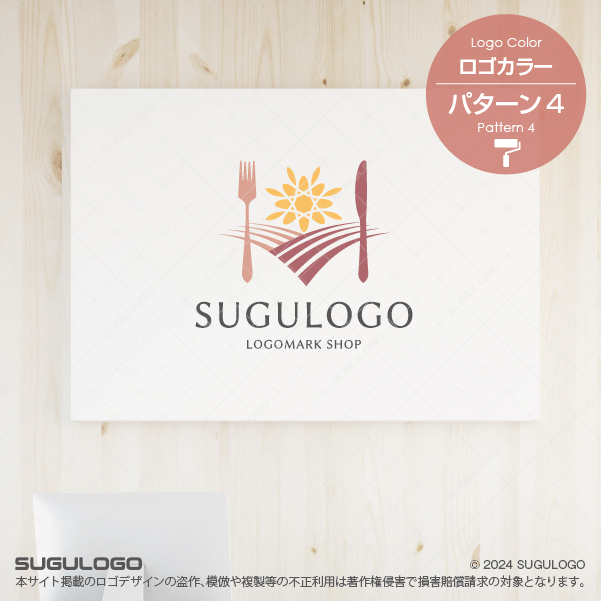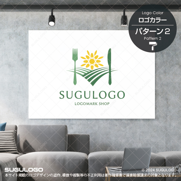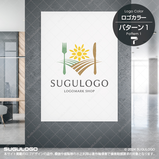地平線から昇る太陽と豊かな田園風景、そして左右に配置されたフォークとナイフが調和したロゴデザインです。食の原点である大地と、それをおいしく提供する食卓の繋がりを象徴的に描いています。中央のシンボルマークは、幾重にも重なる曲線で耕された畑を表現し、頂点に輝く幾何学的な太陽が生命力と収穫の喜びを感じさせます。自然の恵みを大切にする誠実な姿勢と、素材へのこだわりを視覚的に伝える温かみのあるフォルムが特徴です。このデザインは、生産者と消費者を結ぶ確かな信頼関係を築き、地域社会と共に豊かな食文化を育んでいく組織の結束を促します。明るい未来へと向かう発展的なビジョンを掲げ、ブランドの永続的な成長を支えます。【おすすめの業種】イタリアン、農園レストラン、カフェ、食品販売、農業法人、キッチン雑貨