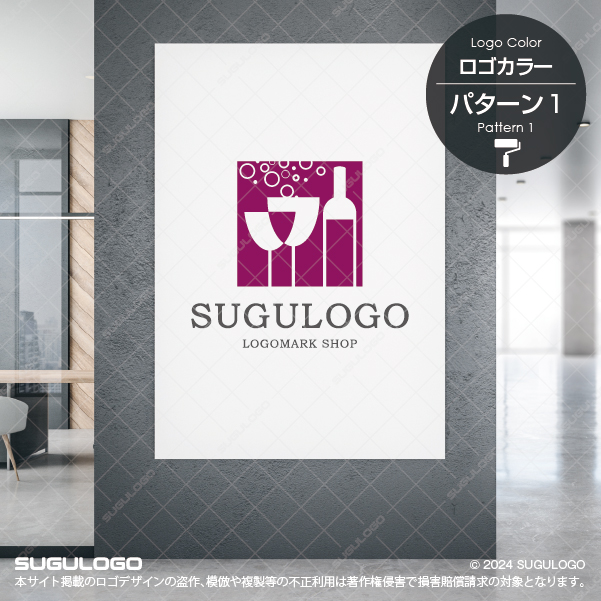 スクエアの枠内に、ワインボトルと重なり合う2つのグラス、そして上部に舞い上がる気泡をシルエットで表現したロゴデザインです。ボトルとグラスの直線的な美しさと、自由に弾ける円形の泡が対照的に描かれ、洗練された大人の空間と楽しげな活気を同時に演出しています。中央のシンボルマークは、背景とのコントラストを活かしたモダンな意匠が特徴で、提供される飲料の品質と豊かな風味を直感的に伝えます。無駄を削ぎ落としたスタイリッシュな構成が、ブランドの専門性と高級感を際立たせます。この調和のとれた造形は、人々が集い喜びを分かち合う至福の時間を象徴し、組織の結束を深めながら、関わるすべての人を笑顔にする発展的なビジョンを描き出します。【おすすめの業種】バー、洋食レストラン、バル、酒造メーカー、ラウンジ、ケータリング