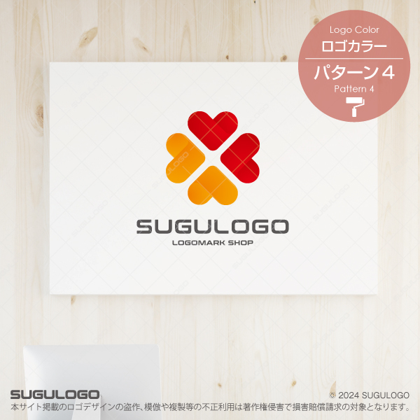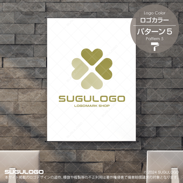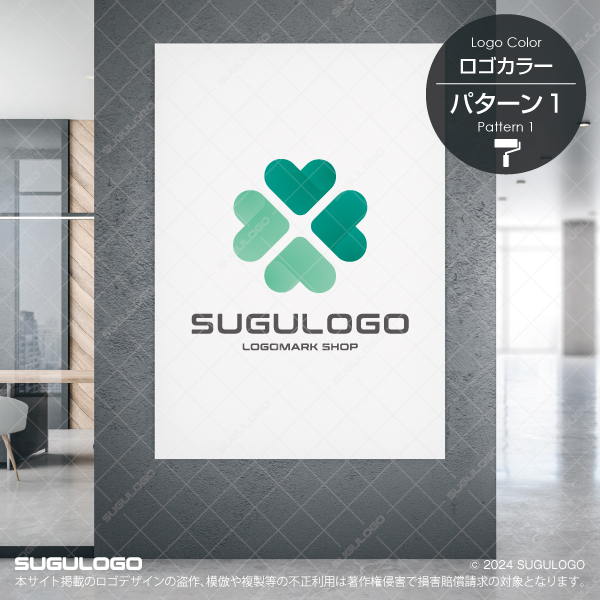 幸福の象徴である四つ葉のクローバーのシルエットを、4つのハートが寄り添う洗練された幾何学模様として描き出したロゴデザインです。中心から十字に広がる均整の取れたフォルムは、組織としての揺るぎない安定感と、多角的な視点から生まれる円満な調和を表現しています。シンボルマーク全体が醸し出す穏やかな品格は、確固たる信念に基づいた真摯なサービスと、関わるすべての人を温かく包み込むブランドの深い誠実さを体現しています。抽象的な美しさをモダンに構築したこの意匠は、社会にしっかりと根を下ろし、人々の心に寄り添いながら輝かしい未来を築いていく組織の結束力と更なる繁栄を象徴しています。【おすすめの業種】福祉・介護サービス、医療・クリニック、教育・スクール、美容・サロン、結婚相談所・ブライダル